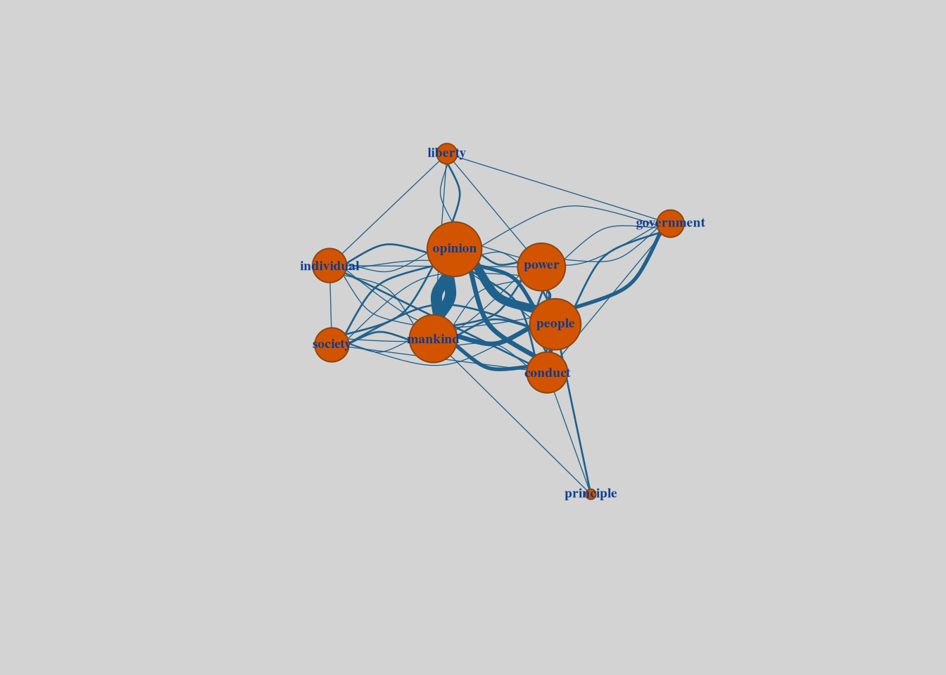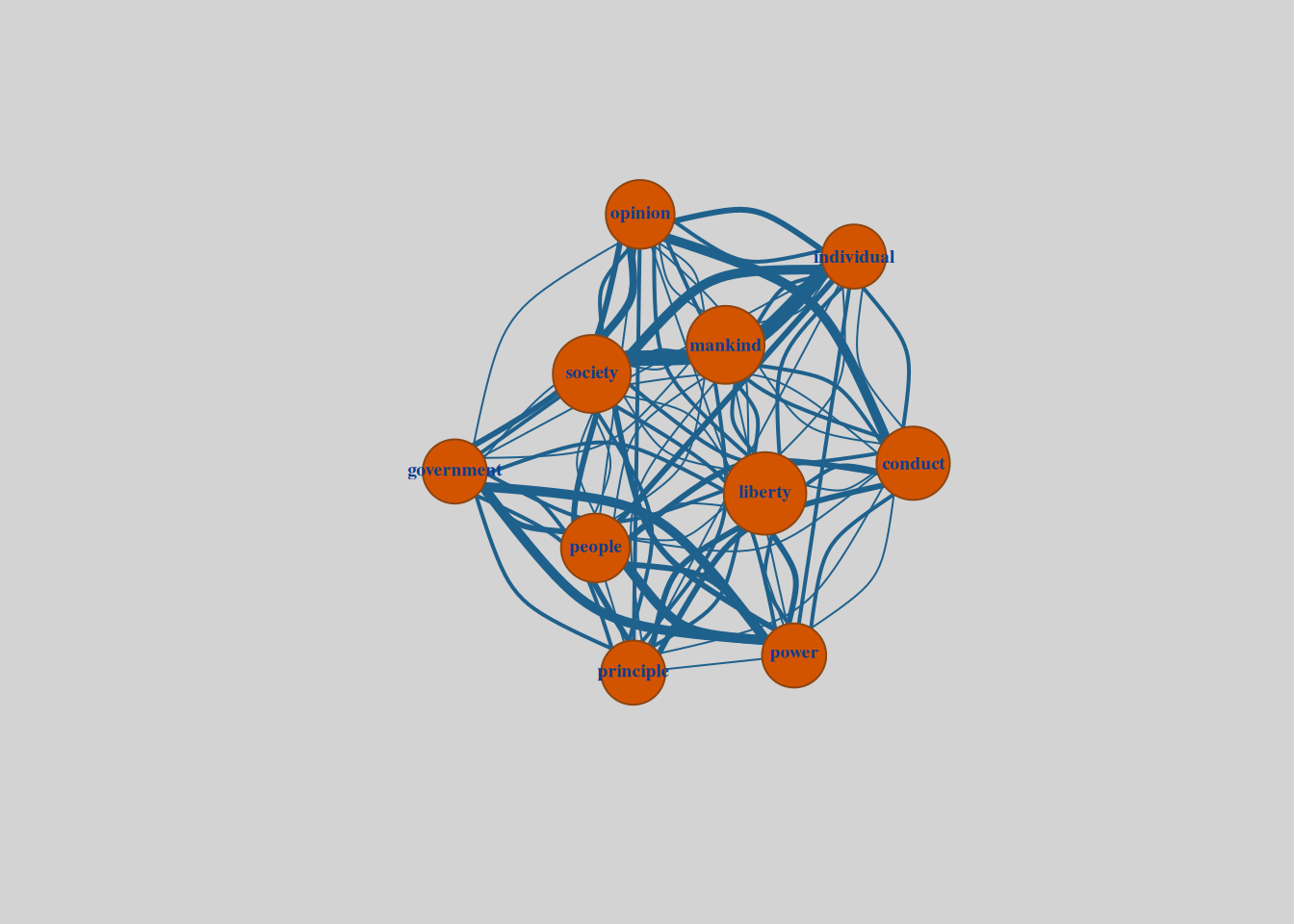 As we were able to reveal through previou analysis John Stuart Mill’s On Liberty explores the balance between individual freedom and societal authority. Analyzing word co-occurrence frequencies within each chapter, paired with network graphs, gives us a quantitative and visual means of understanding how Mill develops his arguments across the text. Each chapter’s thematic focus is illuminated by the most frequent word pairings, revealing both the ideas themselves and their progression throughout the essay.